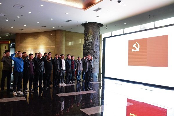 參觀結束后,在中原英烈紀念館一樓展廳內,面對鮮紅的黨旗,全體黨員胸佩黨徽,由于副書記領誓,大家舉起右拳,高聲重溫了入黨誓詞。隨后,集體觀看了“不忘初心、牢記使命”主題教育宣傳片。