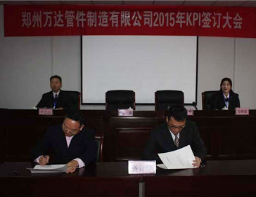 2016/01/28 555 鄭州萬達管件制造有限公司2015年KPI簽訂會于1月30號在公司行政區會議室隆重舉行,公司班長以上所有管理人員參加了此次簽訂會議。簽訂會分為三級簽訂,即:董事長與總經理簽訂、總經理與公司各高管簽訂、公司各高管與分管的各部門負責人簽訂,近期,各部門負責人將部門的KPI指標進行分解,與各班組及相關崗位簽訂目標責任書,達到千...