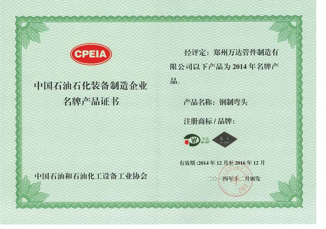 我司“益工”牌“鋼制彎頭”被評為“2014年中國石油石化裝備制造企業名牌產品”