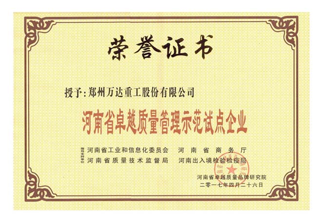 熱烈祝賀鄭州萬達重工股份有限公司榮獲由河南省工業和信息化委員會、河南省商務廳、河南省質量技術監督局及河南出入境檢驗檢疫局等單位共同指導,河南省卓越質量品牌研究院組織評選認定的“河南省卓越質量管理示范試點企業”榮譽稱號。