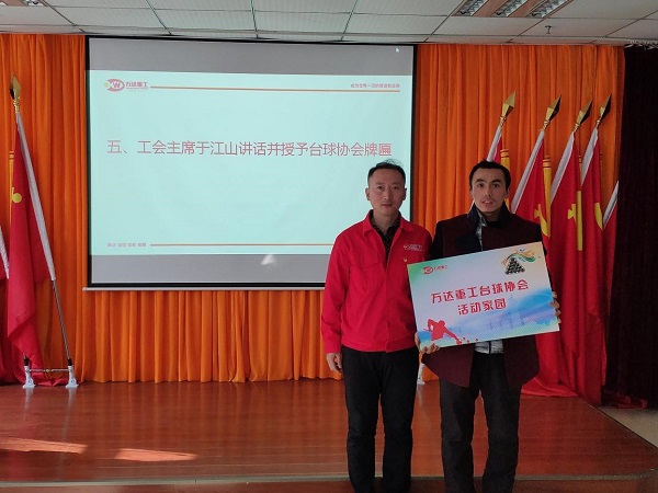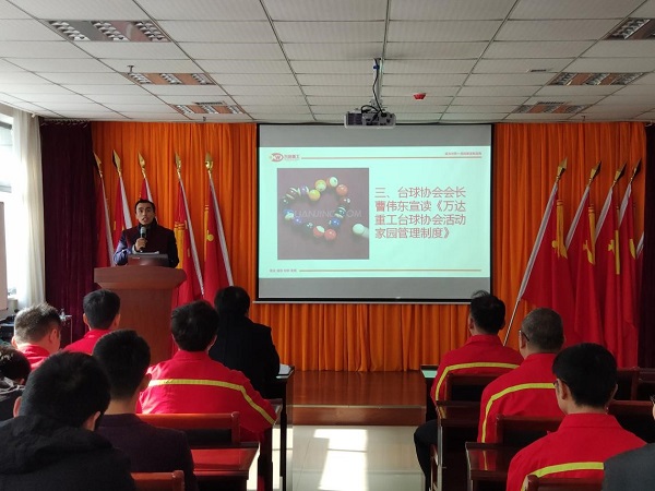 為豐富員工業余文化生活,共創幸福萬達事業,在公司領導的大力支持下,在萬達重工工會辦的牽頭下,萬達重工臺球協會成立大會于2018年11月29日在公司二樓會議室隆重召開,萬達重工臺球協會全體成員參加了本次大會。公司袁總、馬總、劉總等公司高管前來表示祝賀。