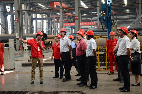 張會長一行先后深入堆焊智能制造車間、彎制車間、機加工、物流倉儲等生產車間進行了參觀,實地查看了公司先進的生產設備、繁忙而有序的生產環境,股份公司總經理張付峰分別就公司生產設備、技術及生產能力情況向調研組一行進行了詳細講解,調研組一行對萬達重工現代化的管理理念,一流的生產能力表示贊賞。
