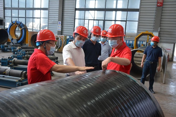 隨后,高義一行深入萬達重工堆焊智能制造車間、彎制車間等聯合工房進行參觀指導,實地了解公司的生產運營情況,股份公司董事長、書記何清就公司核心用戶、科技創新、生產裝備、技術及生產能力、產品市場等情況向調研組作了詳細匯報,高副市長認真聽取了產業發展情況匯報,了解企業發展過程中遇到的難題,聽取了對進一步改善營商環境的建議。