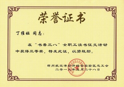 2019/06/11 681 5月28日,鄭州航空港經濟綜合試驗區總工會下發表彰通知,在全區女職工中開展的逐夢新時代巾幗綻芳華為主題的書香三八女職工讀書征文活動中,我公司員工丁維婭的作品獲得三等獎,并下發榮譽證書及鄭州市新華書店購書卡以資鼓勵。 為深入學習貫徹習近平新時代中國特色社會主義思想和黨的十九大精神,引導廣大女職工在閱讀中培育和踐行社會主義...