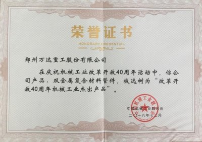 2019/03/06 622 改革開放40周年之際,在中國機械工業聯合會舉辦的機械工業杰出產品征集及宣傳活動中,鄭州萬達重工股份有限公司雙金屬復合材料管件被選樹為改革開放40周年機械工業杰出產品。 該項榮譽的取得,標志著我公司具有自主知識產權的雙金屬復合材料管件已經能夠與當今國內外一流產品比肩,其具有的國際先進水平已經得到用戶認可。