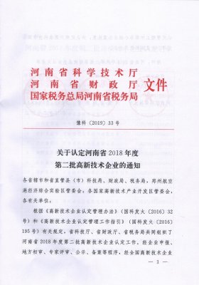 喜訊:鄭州萬達重工股份有限公司被認定為河南2018年度高新技術企業