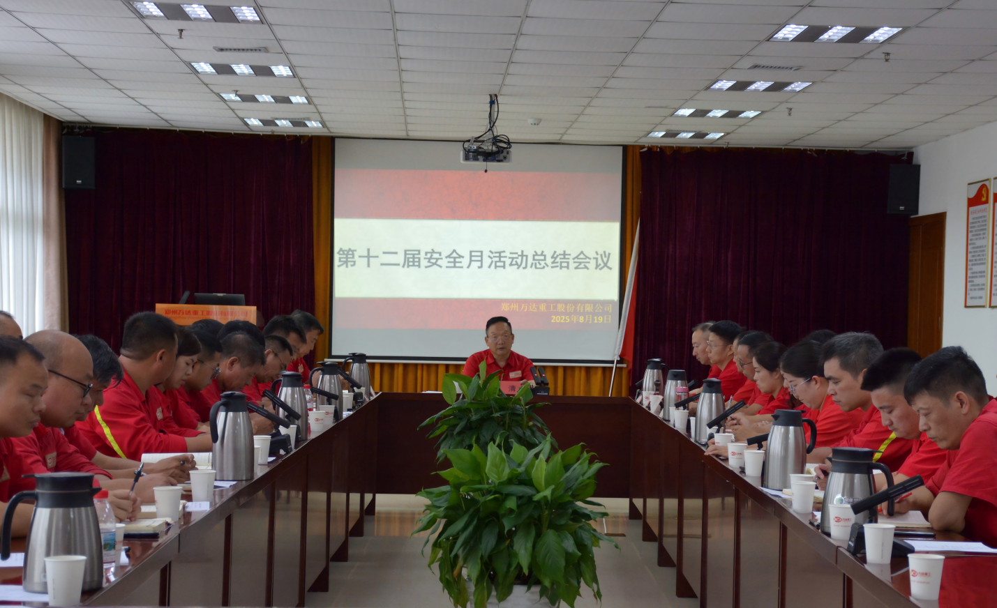 2025/08/20 1047 2025年8月19日下午,鄭州萬達重工股份有限公司在行政樓二樓會議室召開了股份公司第十二屆安全月活動總結會議。股份公司黨委書記、董事長、活動領導小組組長何清,安